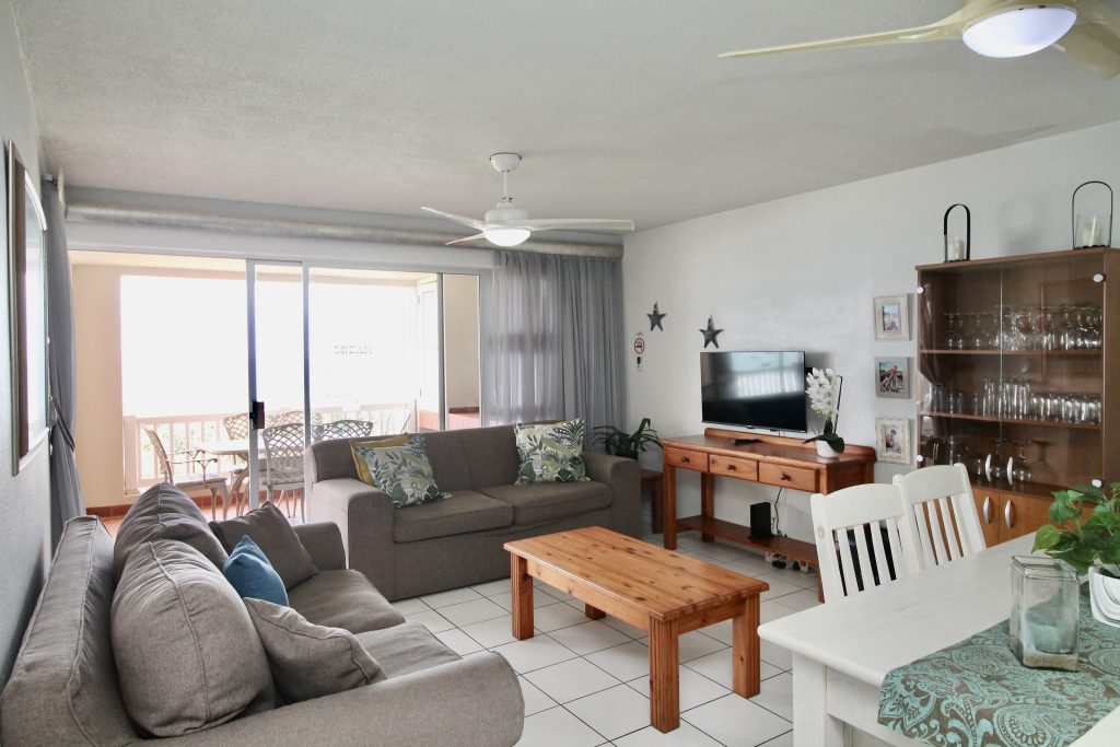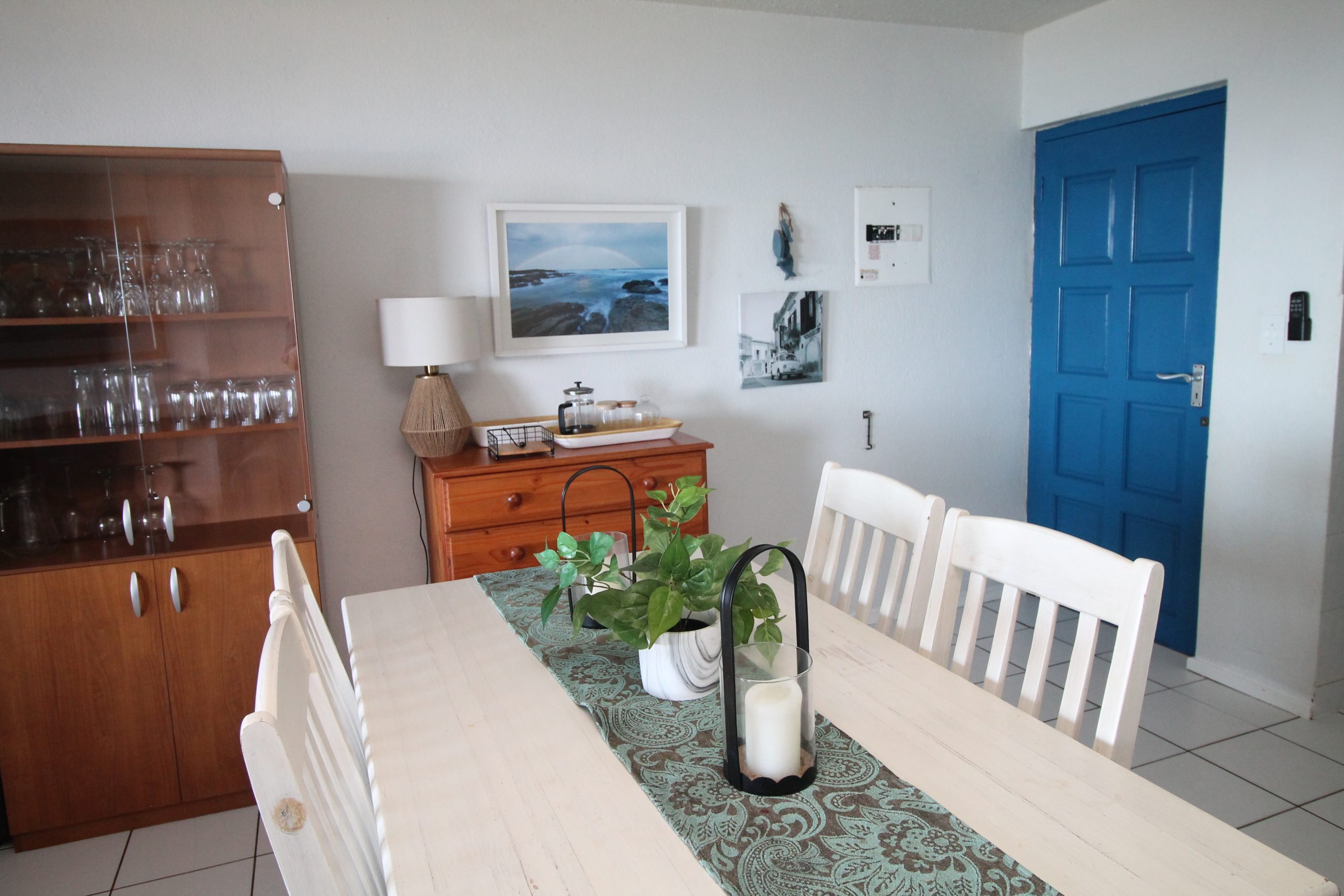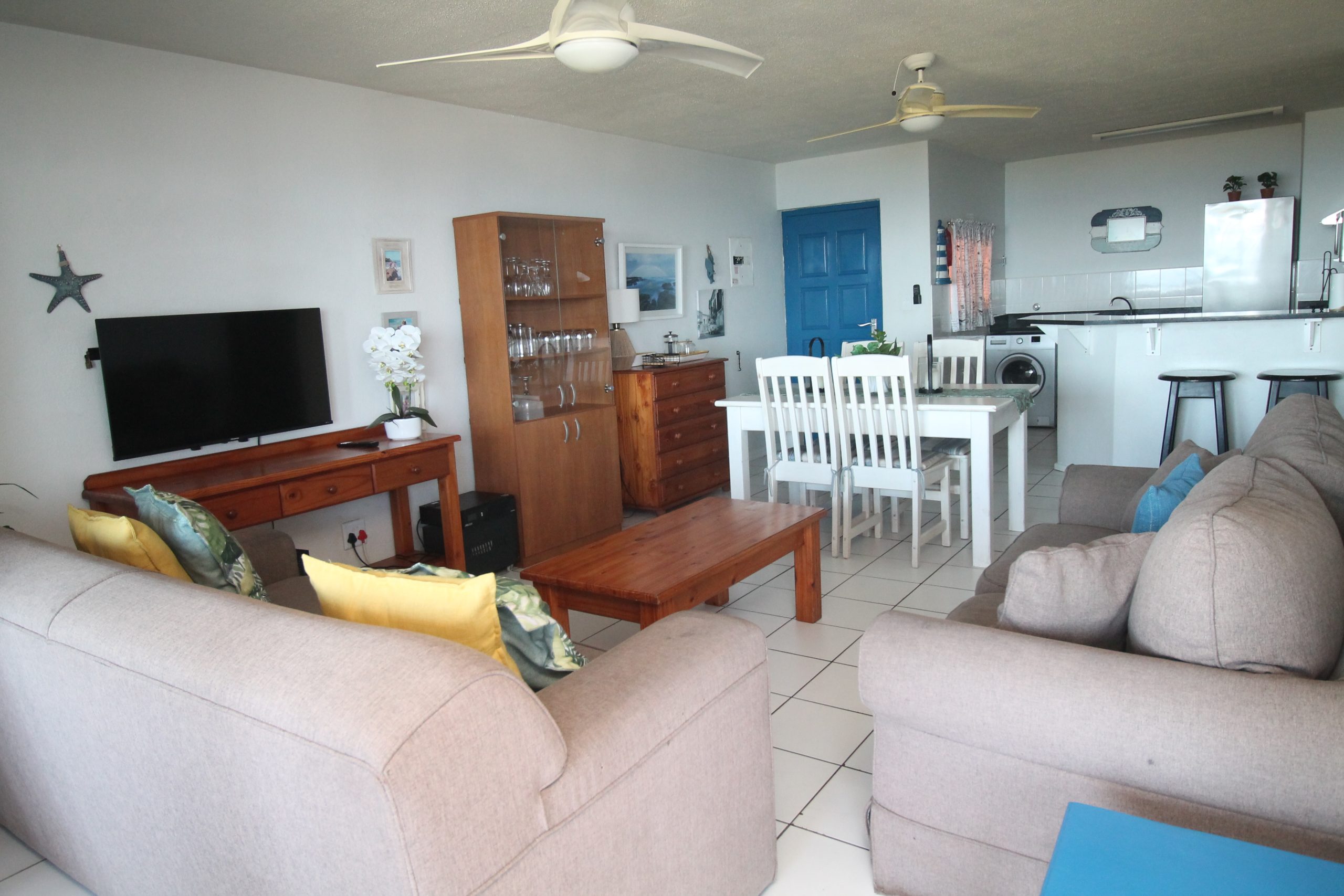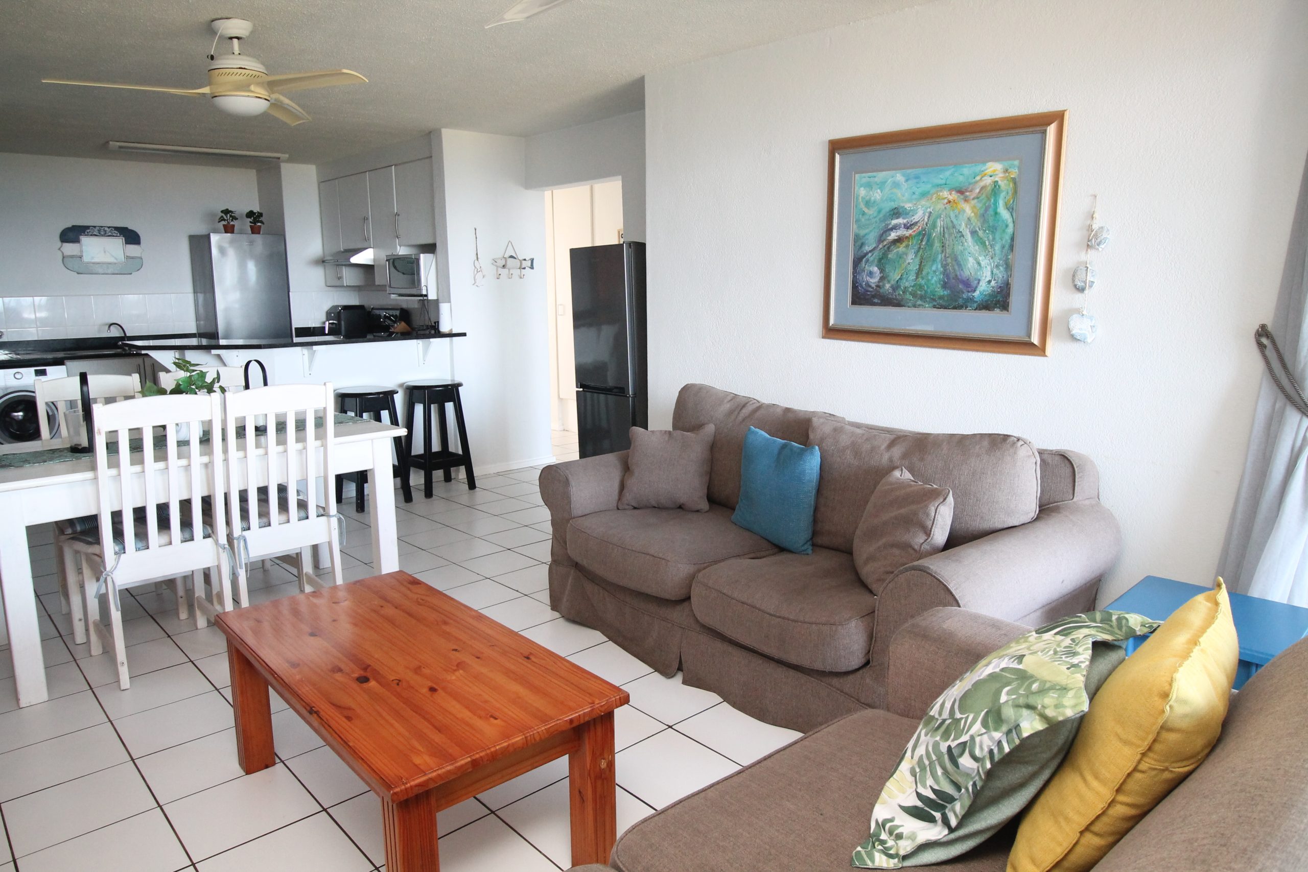 This open-plan living area merges kitchen, dining and lounge zones into a seamless, light-filled space, flowing through a glass door onto a spacious, scenic balcony. The design maximises panoramic sea-views, creating an airy, indoor-outdoor lifestyle that feels inviting. On the balcony is a gas braai which is designed for comfortable entertaining and effortless cooking. Whether relaxing on the sun drenched beach, soaking up the sun at the pool or braaing on the balcony, watching the sun set, this home away from home will not disappoint.