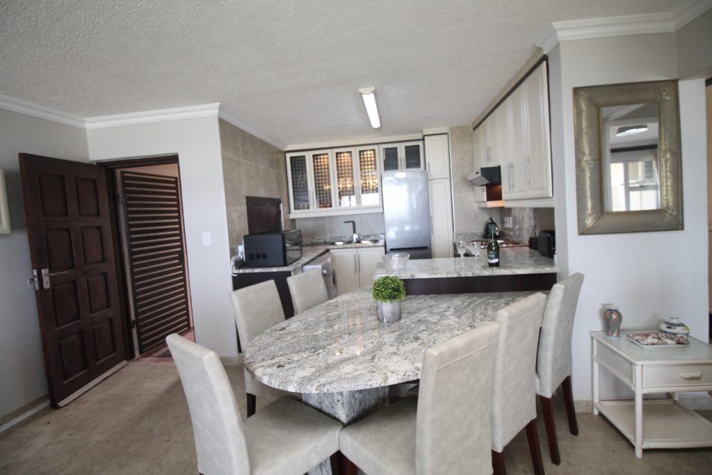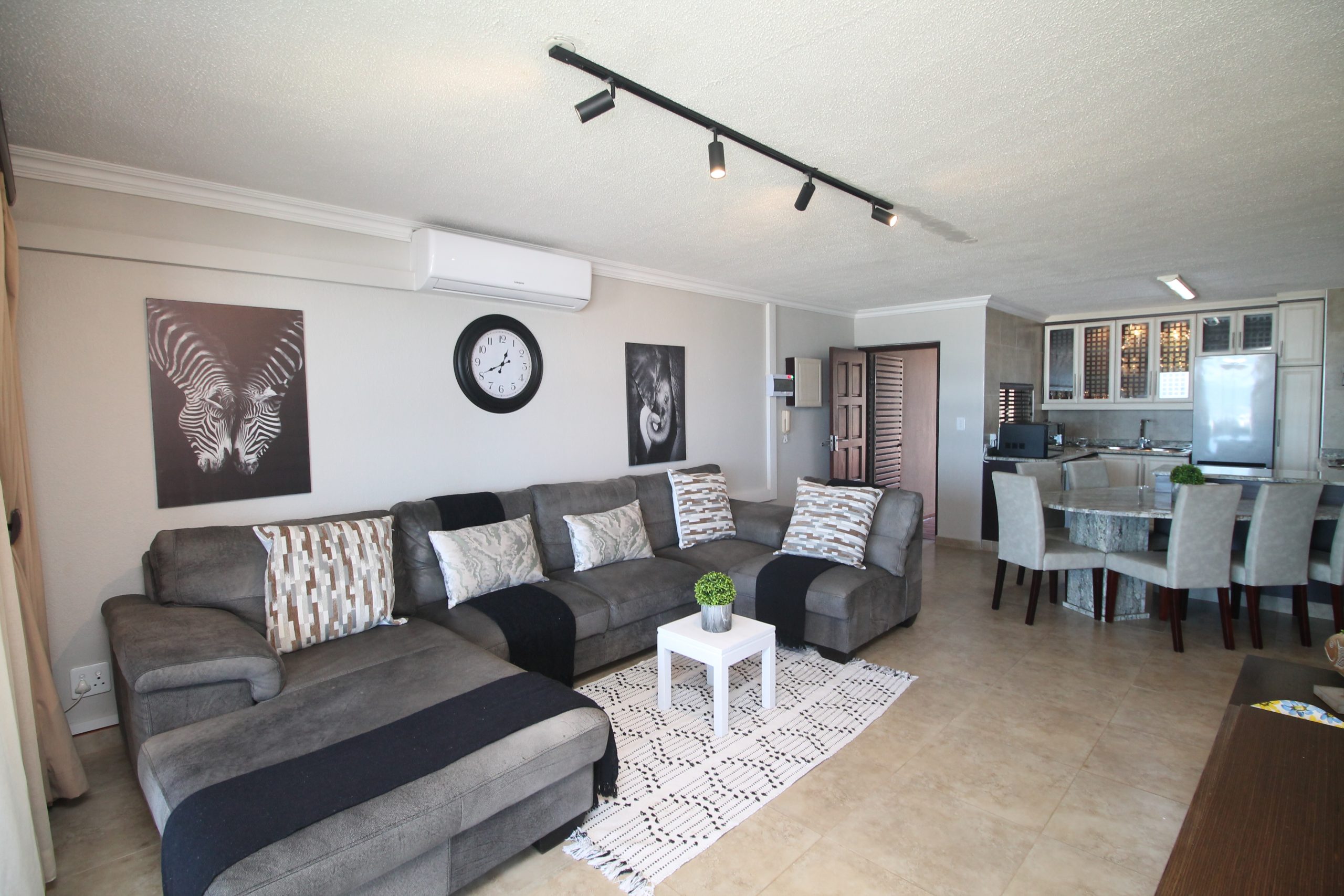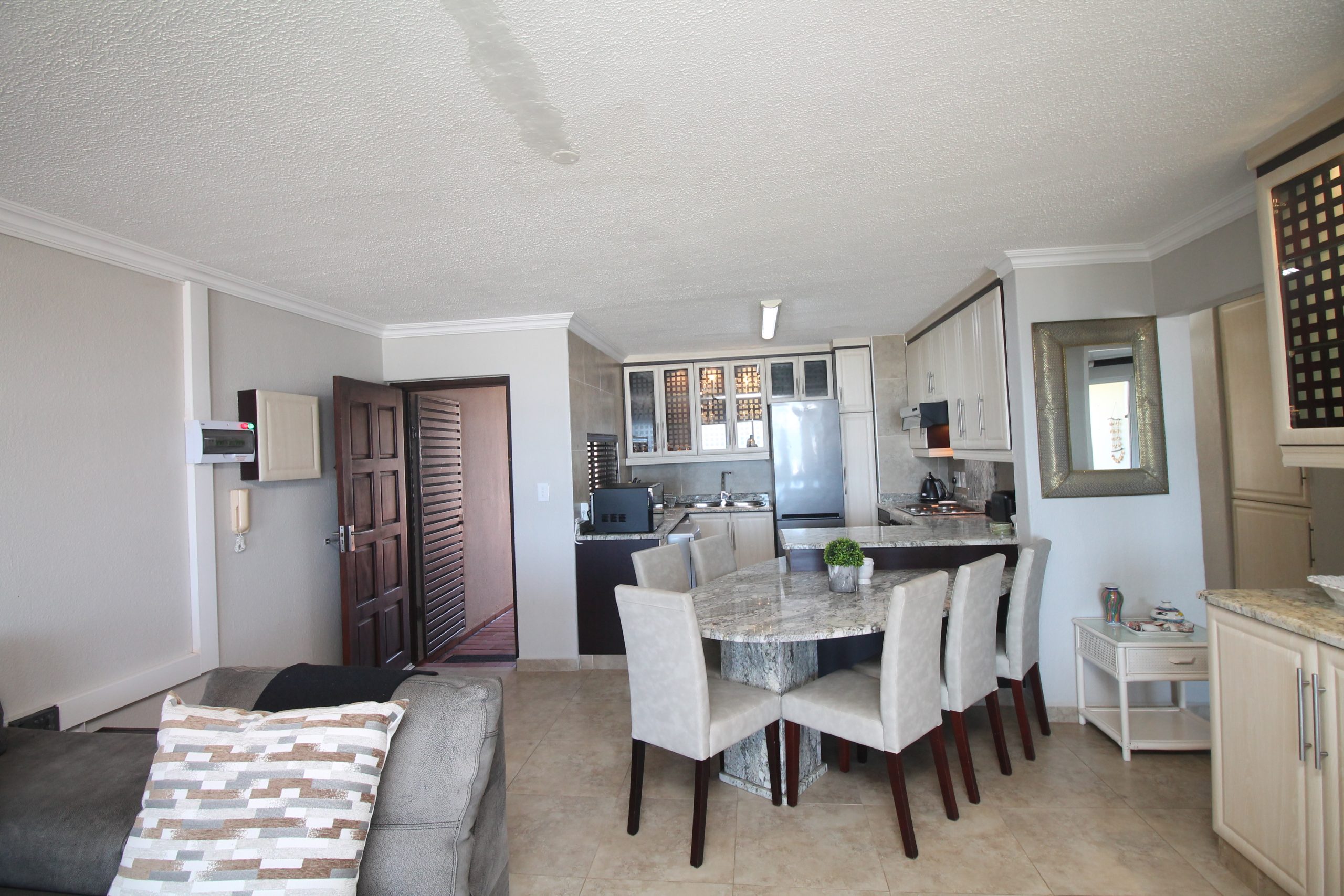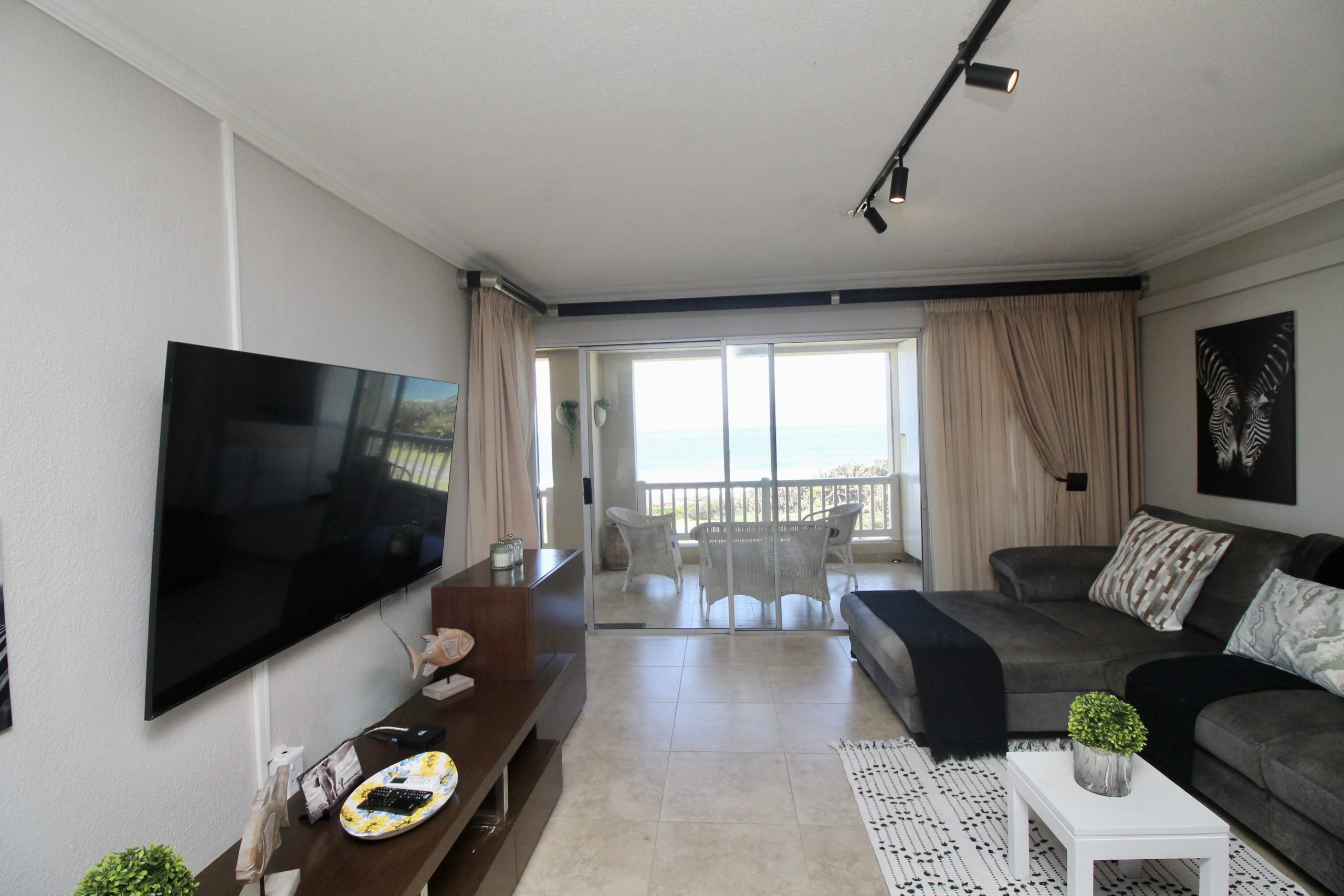 It also offers a premium experience with the sound of waves and a beautiful pool creating a tropical paradise for guests. The open-plan living area that flows onto a spacious balcony creates a harmonious connection between indoor and outdoor living spaces. Stay cool and comfortable all year round with air-conditioning in the living room as well as the main bedroom. There is a smart TV where there is an open view decoder, guests are welcomed to bring along their own DSTV decoder if you would like to connect to DSTV. Well equipped kitchen suitable for self-catering has a functional layout to help create an enjoyable cooking experience.