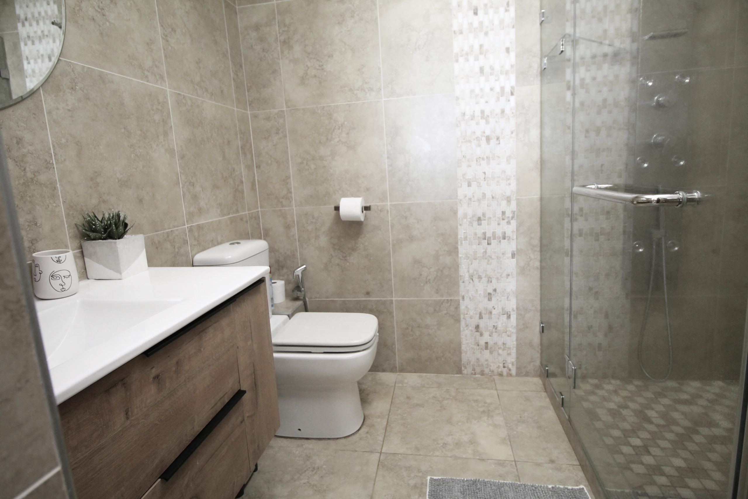 The main bedroom has a queen size bed and has air-con as well as opens up onto the balcony. There is an en-suite bathroom which has a shower. Both the second and third bedrooms each have a double size bed. In the second bedroom there is a shower as well as a bath.