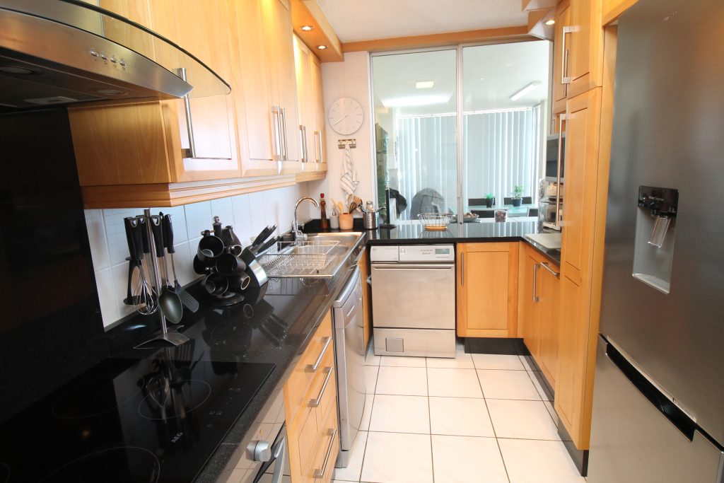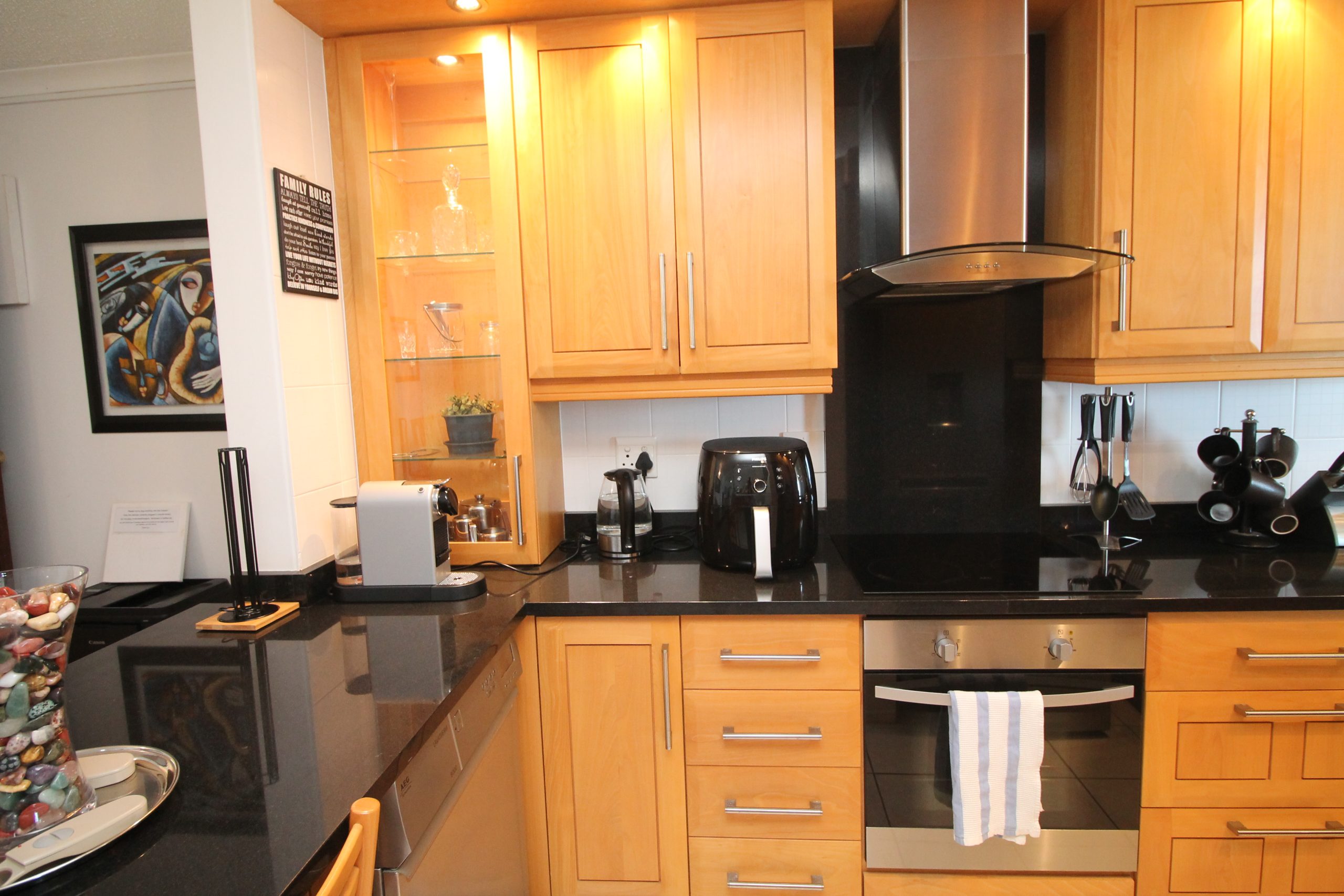 A modern well equipped kitchen with granite countertops is designed for easy meal preparation. It features a fridge-freezer, dishwasher, microwave, washing machine, Nespresso coffee machine, air-fryer. The design emphasises open plan living to maximise space and natural light, creating a seamless flow between the kitchen, dining room and lounge. A living room with comfortable couches is a warm, inviting sanctuary designed for relaxation and socialising.