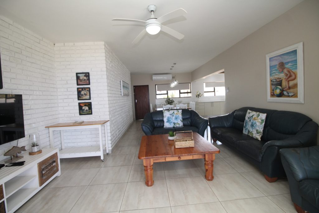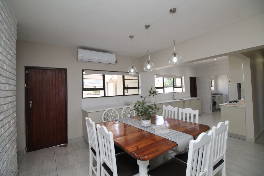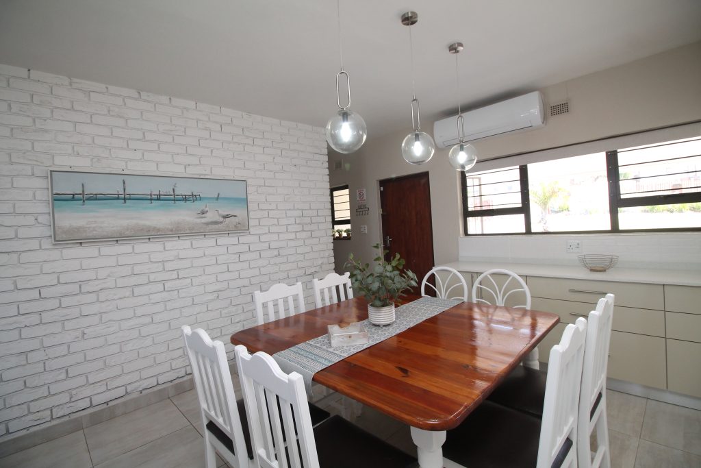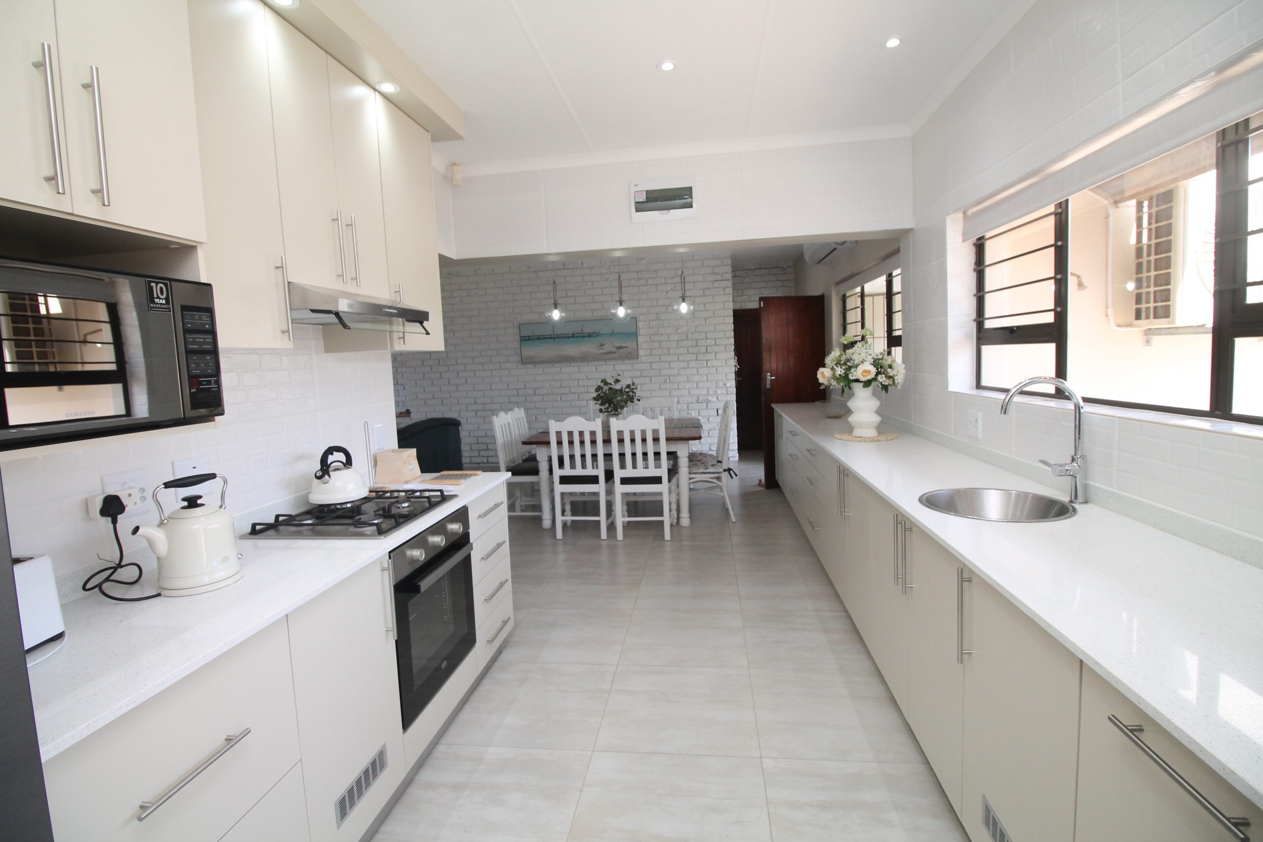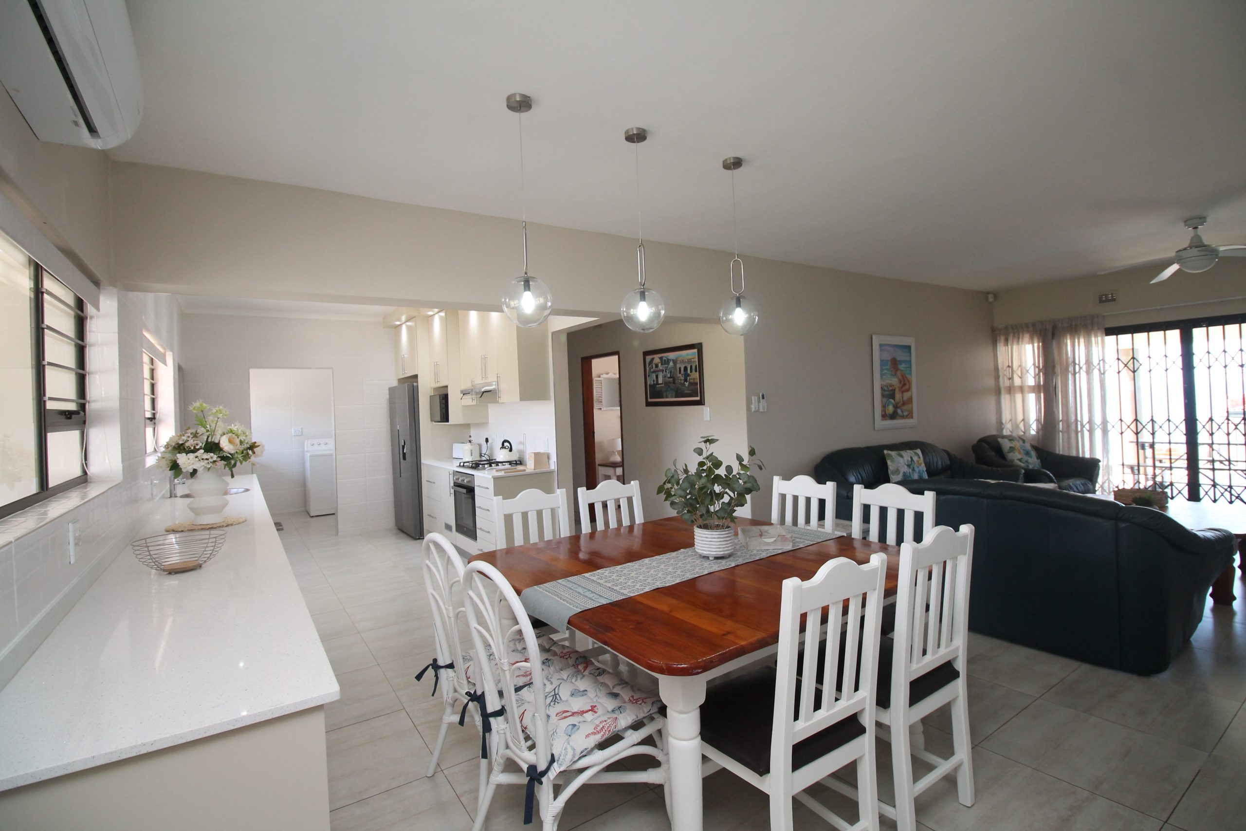 Siloam in Uvongo is a secure 4 Bedroom/ 3 bathroom house that can accommodate 9 people. There is an INVERTER in this holiday home for the lights and TV. There is a large balcony that has a built-in braai and that looks over the swimming pool. Large well-maintained garden with an electric fence. The kitchen is fully equipped for self-catering with a dishwasher, tumble drier as well as a washing machine. The kitchen has a gas stove for added convenience. The dining room and lounge are open plan and opens up onto a veranda that leads to the swimming pool. There is an AIR-CON in the downstairs living area. The house has also been fitted with an inverter.